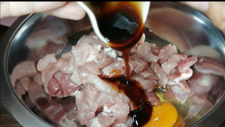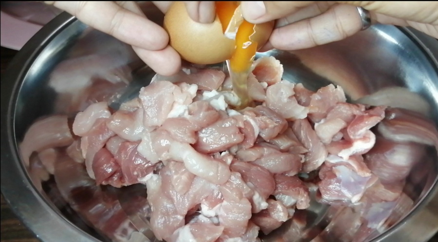 2. เมื่อได้หมูตามต้องการแล้ว ขั้นตอนแรก ให้เพื่อนๆตอกไข่ไก่ใส่ลงไป 1 ฟอง