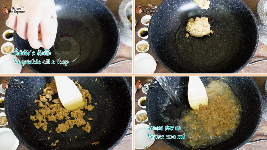 6. เทน้ำมันลงในกระทะ ใส่งา ขิง เต้าเจี้ยวที่ตำละเอียดลงไปผัด พอส่วนผสมเริ่มสุกและแตกตัว ให้ใส่น้ำลงไป คนให้เข้ากัน