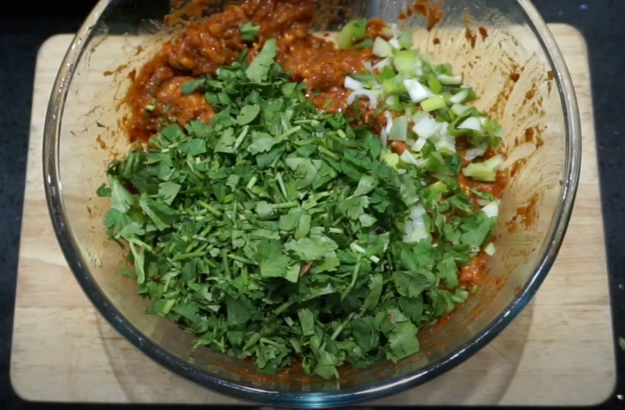 2. ผสมเครื่องแกง + หมูสับ + ซีอิ๊วขาว + น้ำปลา นวด ๆ ผสม ๆ ให้เข้ากันดี