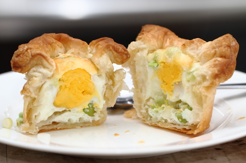เมนูนี้เราต้องต้มไข่ให้เป็นยางมะตูมก่อน เสร็จแล้วก็เอาแป้งครัวซองค์มาพันให้เรียบร้อยแล้วจัดการอบ 15 นาที จะกลายร่างเป็นไข่ครัวซองค์แสนอร่อยที่ได้รสชาติของไข่และความหอมของครัวซองค์