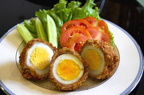 ใช้เนื้อหมูบดละเอียดปรุงรส ห่อกับไข่ที่ต้มสุกแล้ว ชุบกับเกล็ดขนมปังอีกชั้นเพื่อสร้างชุดเกราะ เสร็จแล้วนำไปทอดระดับไฟปานกลาง ได้ที่ก็ยกมาเสิร์ฟพร้อมกับน้ำจิ้ม