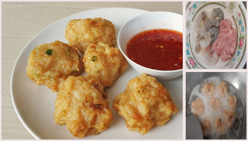 1. ล้างกุ้งให้สะอาด แกะเอาแต่เนื้อ นำใส่เครื่องบดพร้อมกับหมูเด้ง แป้งมัน 1ช้อนโต๊ะ (กุ้งกับหมูเด้ง ควรแช่เย็น)
