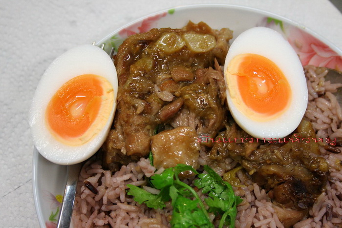 12. ให้ดูระดับน้ำขลุกขลิก โดยจะเห็นกระเทียม รากผักชี พริกไทย ข้นๆ ปนอยู่กับน้ำมัน ไม่ใช่ปนอยู่กับน้ำ เมื่อปิดเตาแล้วต้องปิดฝาหม้ออยู่เสมอ เพื่อไม่ให้ไอน้ำระเหยโดนลม จนหมูแห้งแข็ง