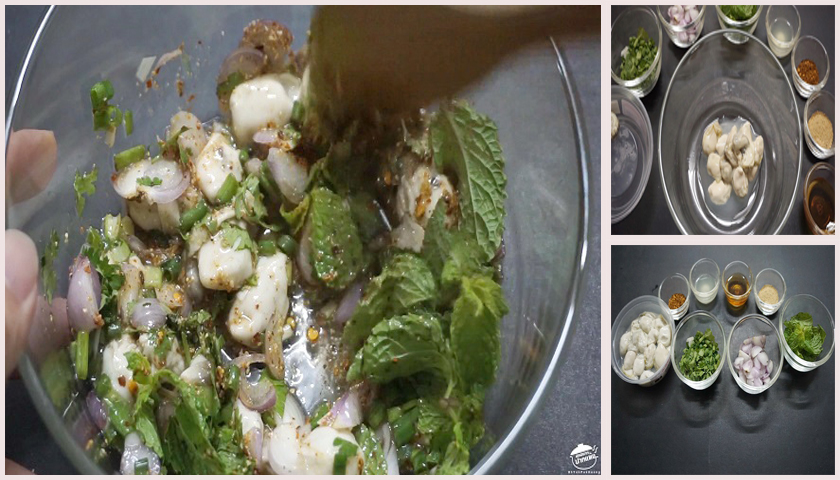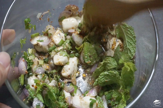 2. ใส่ต้นหอม ผักชี หอมแดง ใบสะระแหน่ ลงไปในชามหอยนางรม แล้วปรุงรสด้วย ข้าวคั่ว พริกป่น น้ำปลา และมะนาว
