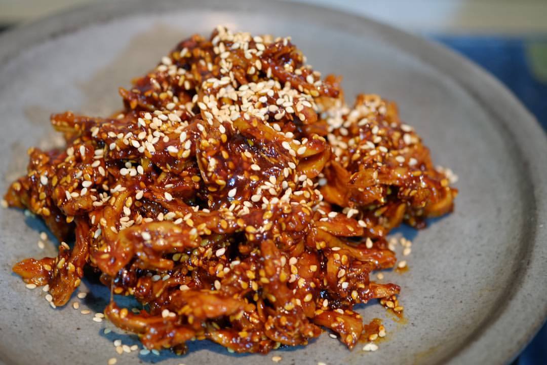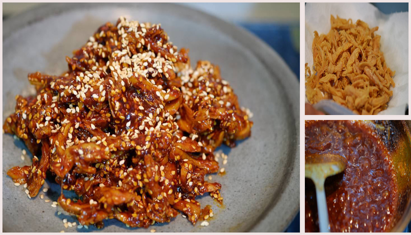 4. เติมโควชูจัง พริกป่น น้ำตาลทราย แล้วเคี่ยวต่อจนได้ซอสเหนียวหนืด จึงปิดเตา ใส่อกไก่ทอดลงไปคลุกให้ซอสเคลือบชิ้นไก่ให้ทั่ว
