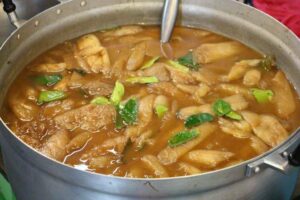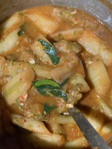 6.ปรุงรสด้วยผงปรุงรส น้ำปลา น้ำตาลปี๊บ น้ำมะขามเปียก ใบมะกรูด รสชาติเค็ม หวาน เปรี้ยวเล็กน้อย เผ็ดไม่มาก เดื อ ดแล้วใส่ใบมะกรูด ตัก