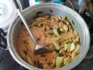 5.เตรียมหม้อตั้งเตา ใส่กะทิ ใส่น้ำเปล่า ต้ ม แล้วใส่หมูสามชั้น ตามด้วยบอน ใส่เกลือไม่ต้องมาก แล้วก็ใส่พริกแกงที่เตรียมไว้ ใส่น้ำปลาร้า