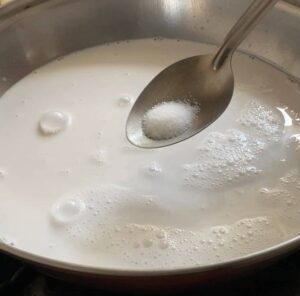 4.นำส่านผสมทั้งหมดคนให้เข้ากันแล้วนำไปตั้งไ ฟ พอพอมีไอขึ้นปิดไฟ