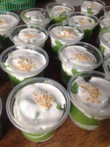 5.จัดใส่กล่องหรือถ้วยให้สวยงามแยกกะทิและขนม ถ้าจะเพิ่มมะพร้าวขูดก็ได้