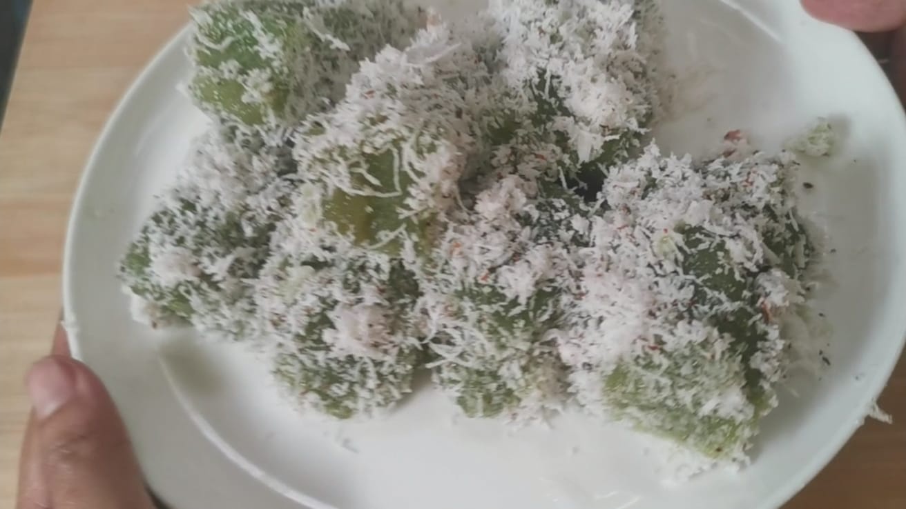 พอนึ่งเสร็จแล้วก็วางทิ้งไว้ให้เย็นสนิท ใช้มีดตัดเป็นชิ้นตามที่ต้องการ จากนั้นนำไปคลุกกับมะพร้าวที่เตรียมเอาไว้ (มะพร้าวให้ผสมเกลือนิดนึงด้วยนะ)