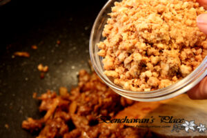 6.ผัดให้เข้ากันดี จากนั้นใส่ถั่วลิสงคั่วบดลงไป