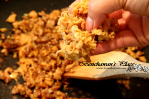 8. พอผัดไส้เข้ากันเรียบร้อยดีแล้ว พักไส้ให้เย็นแล้วนำมาปั้นเป็นก้อนค่ะ