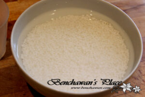 1.ก่อนที่จะปั้นไส้ให้เอาเม็ดสาคูมาแช่น้ำก่อนค่ะ ใช้น้ำอุณหภูมิปกติแช่ทิ้งไว้ประมาณ 30 นาที