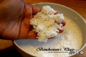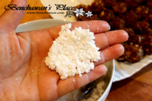 เหนียวเกินไป อย่าลืมว่าเม็ดสาคูที่เราเอามาใช้ คือสาคูเทียมที่ทำจากแป้งมันสำปะหลัง การที่เรานวดแป้งมาก ๆ ก็จะทำให้แป้งเหนียวค่ะ