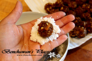 4. นำไส้ที่เราปั้นไว้มาวางตรงกลางค่ะ