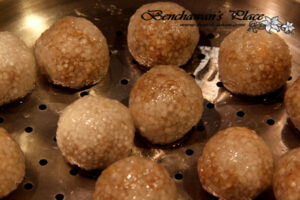 7. จากนั้นนำซึ้งนึ่งมาตั้งน้ำให้เดือด แล้วนำชั้นซึ้งมาทาน้ำมันให้ทั่ว วางขนมสาคูที่เราปั้นลงไปแล้วทาน้ำมันกระเทียมเจียวลงไปที่ขนมด้วย