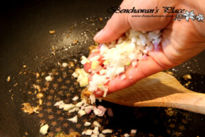 3.จากนั้นนำหอมแดงสับมาใส่ลงไปผัดต่อให้หอม