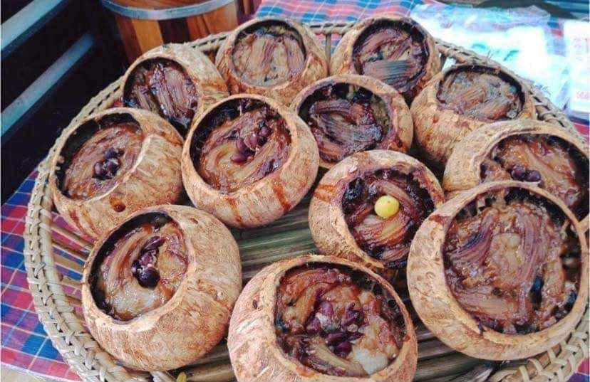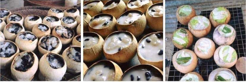 4.นำข้าวเหนียวใส่ในลูกมะพร้าวแล้วใส่ มันม่วงหั่นเต๋า ข้าวโพดหวาน คนให้เข้ากัน ตามด้วยน้ำกะทิ ใส่ให้ท่วมข้าว