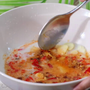 2.ทำน้ำยำ โดยใช้น้ำกะทิต้มหมู ครึ่งถ้วย ใส่ในชามผสม ปรุงรสด้วยพริกแดงจินดา น้ำพริกเผ า น้ำตาลปี๊บ น้ำปลา กระเทียม และน้ำมะนาว