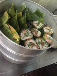 ห่อหมกหมูแบบถ้วยกระทง เราวางใบยอก่อนแล้วตักหมูใส่ ตามด้วยราดน้ำกะทิ แล้วโรยพริกและใบมะกรูด