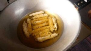 8.ตั้งกระทะใส่น้ำมัน ตั้งไฟปานกลาง แล้วใส่กล้วยลงไปทอด หมั่นพลิกกลับบ่อย ๆ เพื่อให้เหลืองสม่ำเสมอ