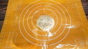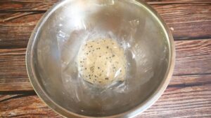 3.เมื่อเข้ากันดีแล้วให้ใช้พลาสติกคลุมปิดแป้งไว้ และพักแป้งไว้ประมาณ 15 นาที