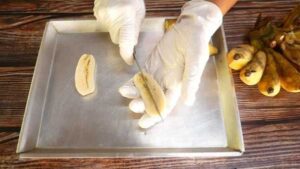 4.ปอกเปลือกกล้วย แล้วผ่าแบ่งตามยาวเป็น 4 ส่วน