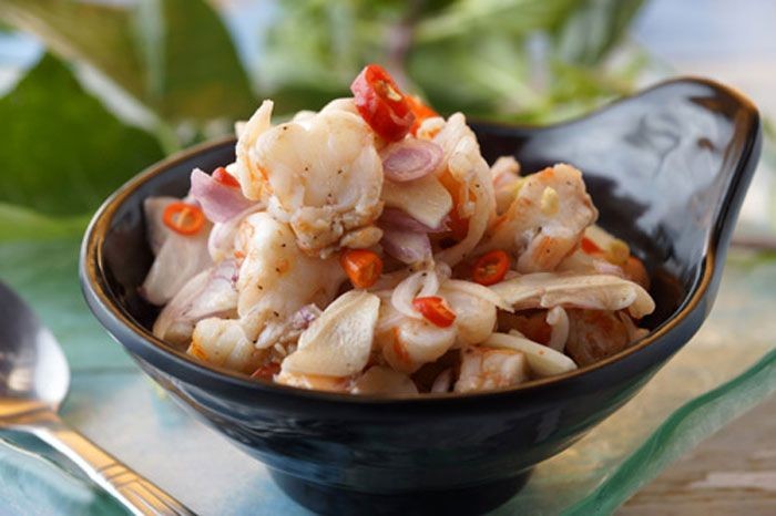 2. ซอยหอมแดง แล้วเคล้ากะปิกับน้ำตาลปีบ น้ำมะนาว ใส่พริกขี้หนู กุ้งสดหั่น