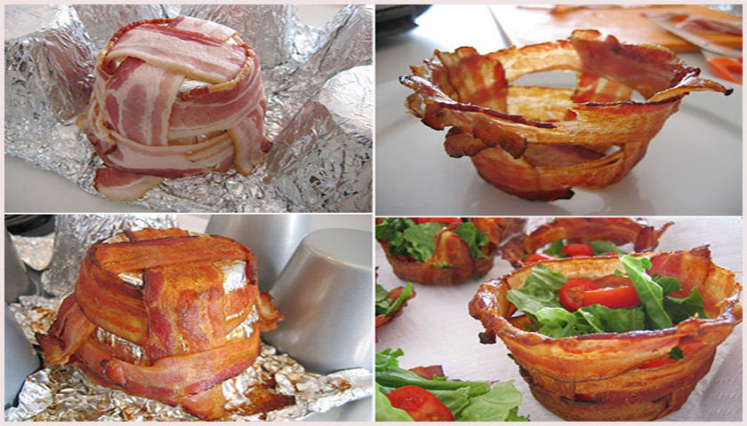 – นำสลัดผักตามชอบใส่ลงไปในตะกร้าเบคอน พร้อมเสิร์ฟ!