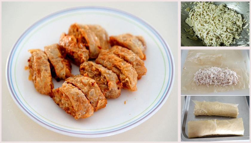 • ตักส่วนผสมวางลงบนแผ่นฟองเต้าหู้ ห่อเป็นท่อน ๆ