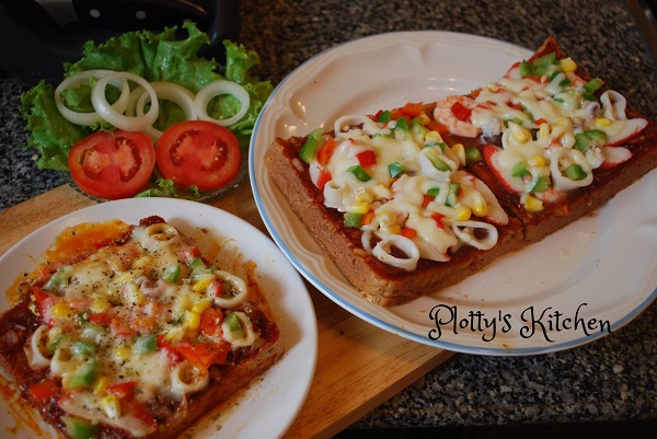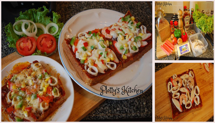 ทาส่วนผสมซอสมะเขือเทศลงบนขนมปัง วางทับด้วยกุ้ง ปลาหมึก ปูอัด พริกฝรั่ง เม็ดข้าวโพด โรยด้วยมอสซาเรล่าชีส