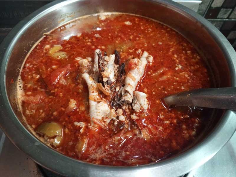 1. ตั้งหม้อต้มซี่โครงหมูและตีนไก่ ใส่เกสรดอกงิ้วตามลงไป (เกสรดอกงิ้วจะแห้งและเหนียว แนะนำให้ล้างทำความสะอาดแล้วแช่น้ำค้างคืนไว้ เวลานำมาต้มจะได้เปื่อยง่าย ระหว่างนี้คอยช้อนฟองและตักไขมัน ต้มไปจนกว่าเนื้อสัตว์จะเริ่มเปื่อย เมนูนี้ปกติจะใส่เลือดหมูหรือเลือดไก่ก้อนด้วย พอดีในบ้านไม่มีคนกิน ก็เลยเลือกที่จะไม่ใส่ หากใครชอบก็สามารถใส่ได้ตามสะดวก