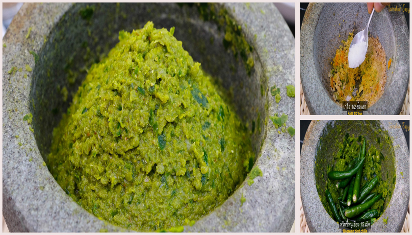 18. จากนั้นใส่พริกขี้หนูเขียวเม็ดใหญ่ลงไป 15 เม็ด แล้วตำให้ละเอียด (ใช้เวลาประมาณ 5 นาที)
