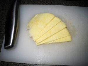 2.ฝานให้เป็นชิ้นบาง ๆ เท่าที่ทำได้ (หรือใช้มีดปอกเปลือก ฝานมันเทศออกเป็นแผ่นบาง ๆ)