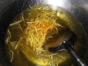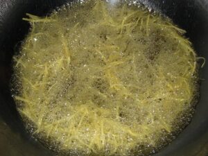 6.พอมันเทศเริ่มเหลือง หรือมีฟองน้ำมันน้อยลงแล้ว แสดงว่าเริ่มได้ที่แล้ว ให้หยิบน้ำตาลปิ๊บประมาณสักหัวแม่มือ บี้ให้แบน แล้วใส่ลงไป เพื่อให้น้ำตาลปี๊บ เคลือบเส้นมันให้ทั่ว