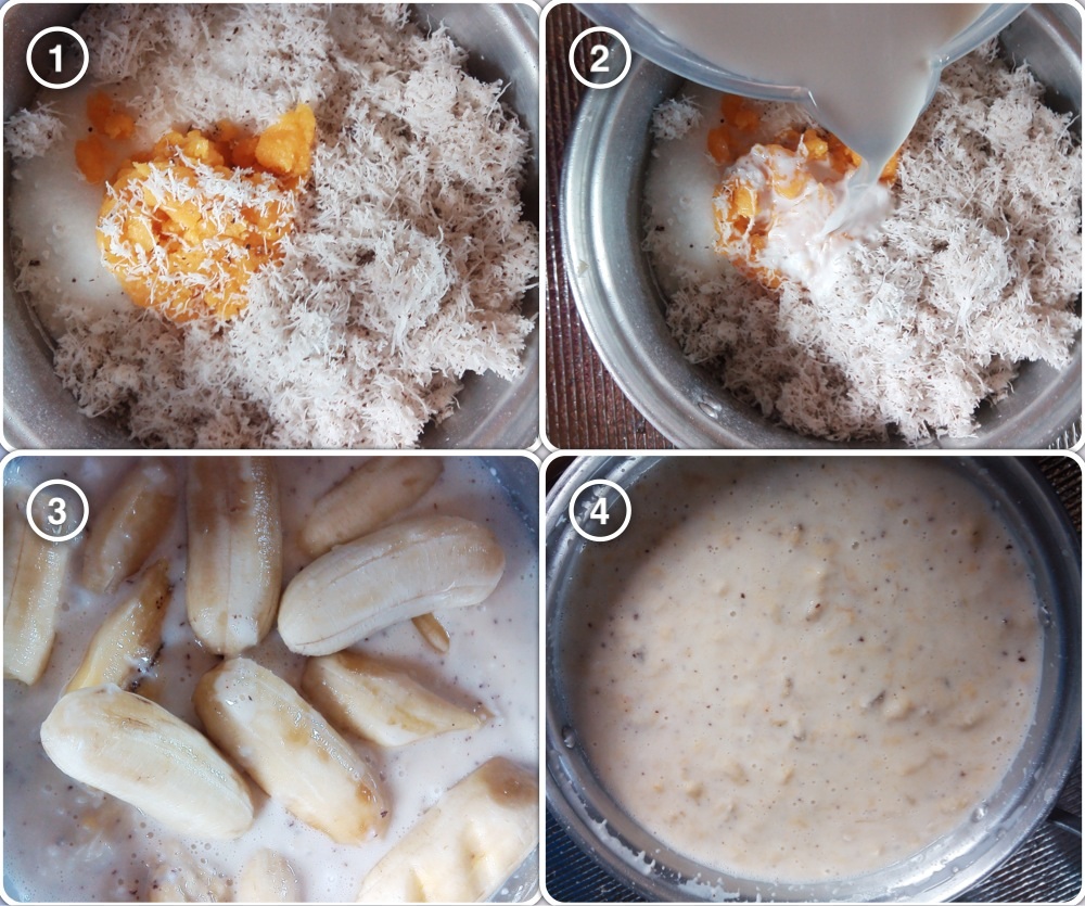 1.ใส่ส่วนผสมลงไปในภาชนะที่เราจะผสม ใส่เกือบทั้งหมดยกเว้นกะทิกับกล้วยค่ะยังไม่ต้องใส่