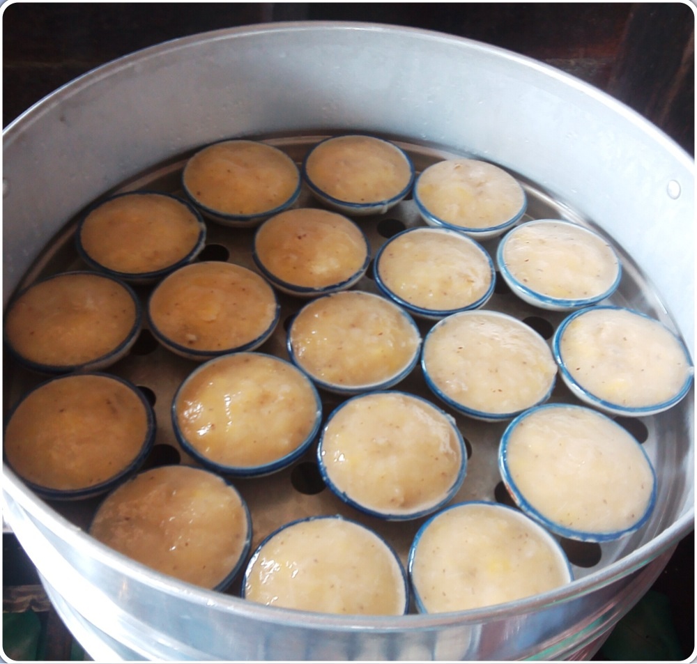 ยกถ้วยออกจากถาดมาพึ่งไว้รอให้เย็นแล้วค่อยแคะออกจากถ้วยตะไลค่ะ