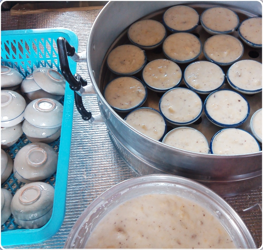 เสร็จจากการทำตัวขนมเราก้อนำซึ้งใส่น้ำตั้งไฟค่อนไปทางไฟแรงค่ะ ระหว่างรอน้ำเดือดก็มาทำขนมกันค่ะ ตักใส่ถ้วยตะไล ในรูปจะเยอะนะคะทำเบิ้ลจากสูตรค่ะ