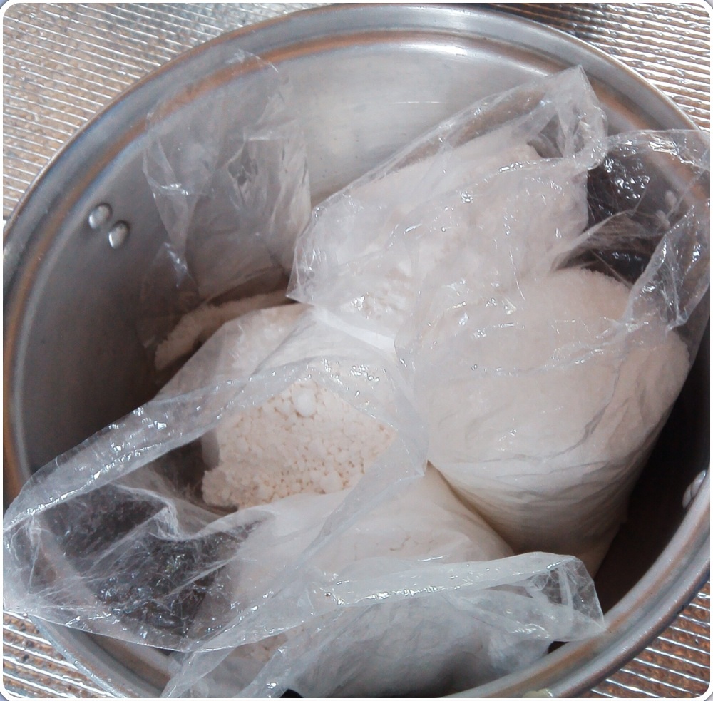 ส่วนตัวทำบ่อยจะตวงส่วนผสมพวกแป้ง น้ำตาล แล้วใส่ถุงเป็นชุดๆไว้แบบนี้สะดวกดีค่ะ