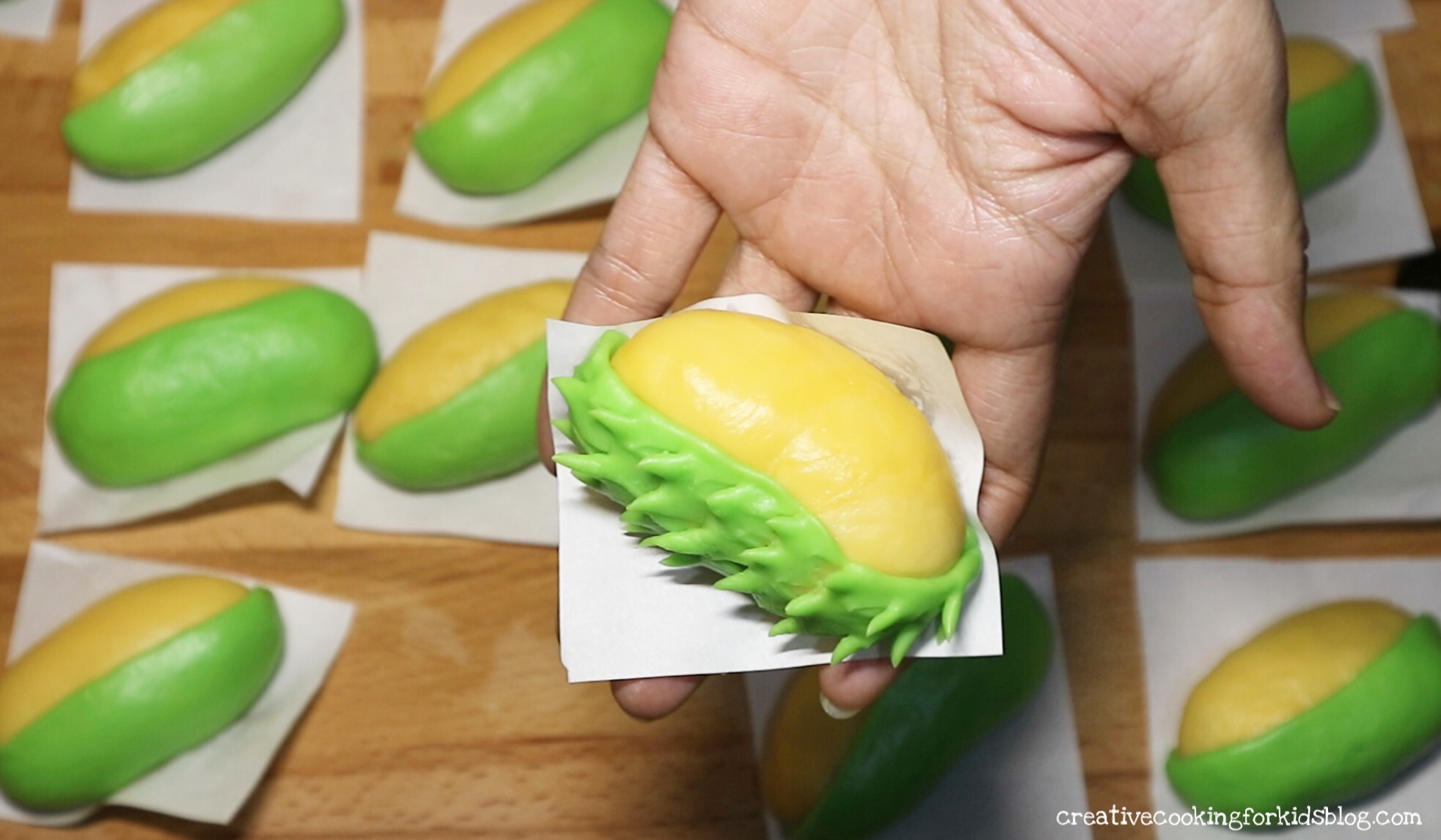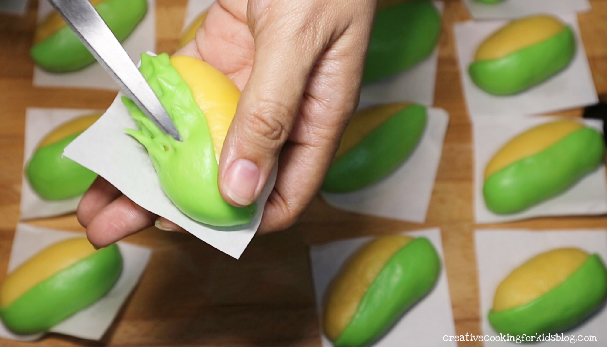 ใช้กรรไกรตัดแป้งสีเขียวให้เป็นหนามทุเรียน​