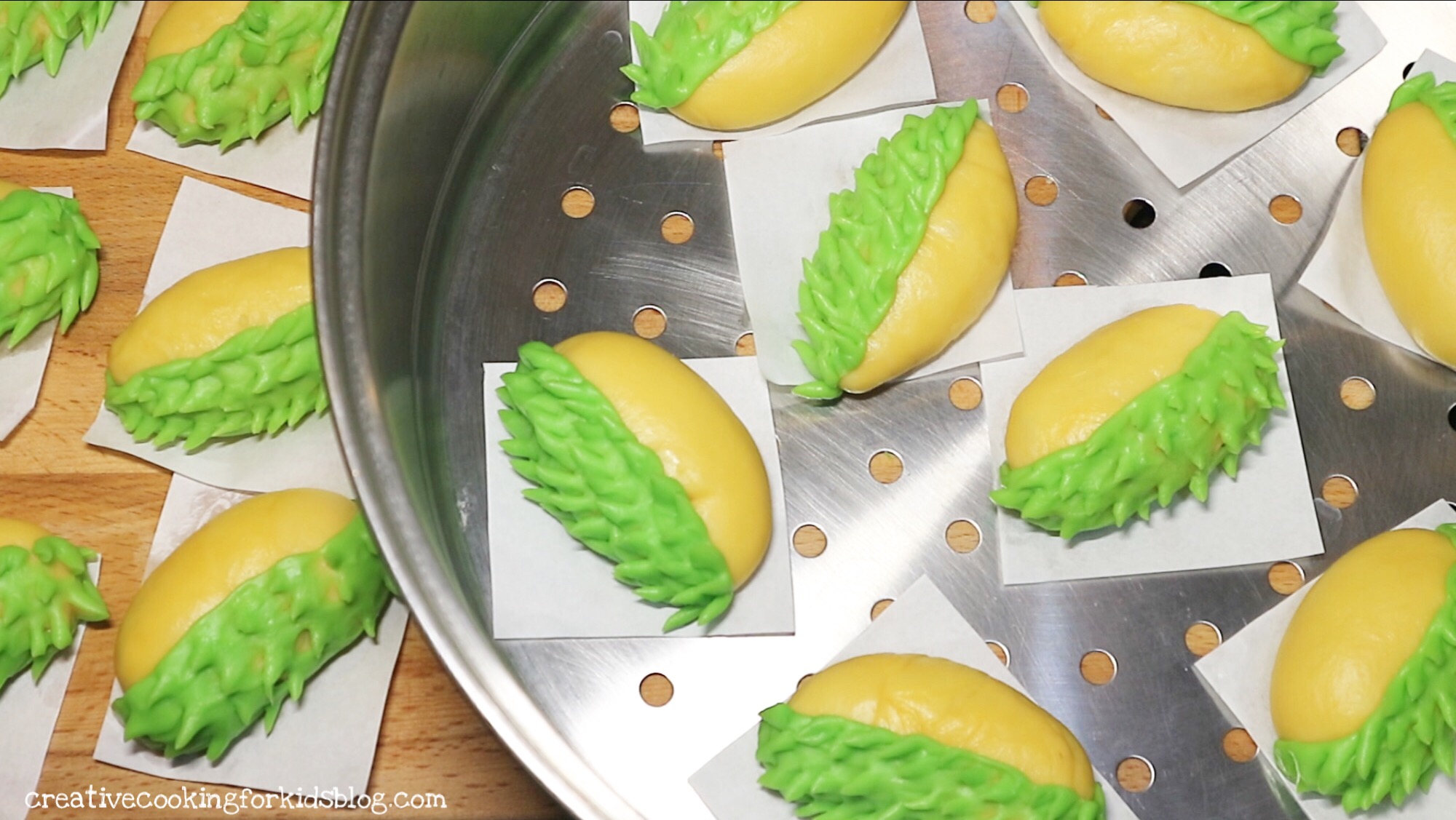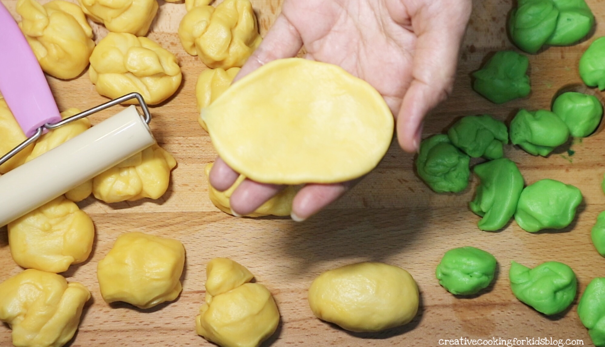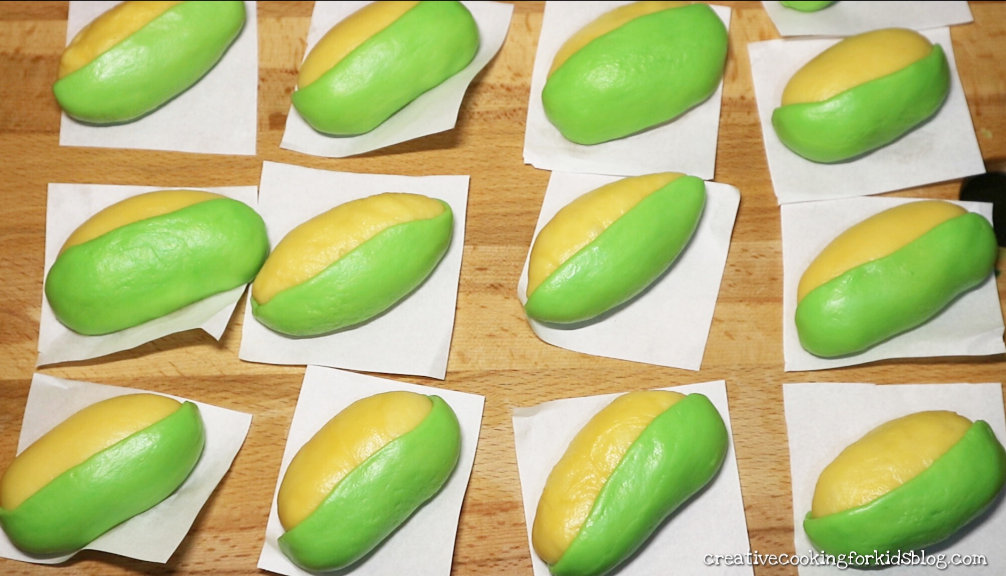 จากนั้นคลึงแป้งสีเขียวให้บาง นำไปห่อแป้งสีเหลือง แล้ววางบนกระดาษซาลาเปา