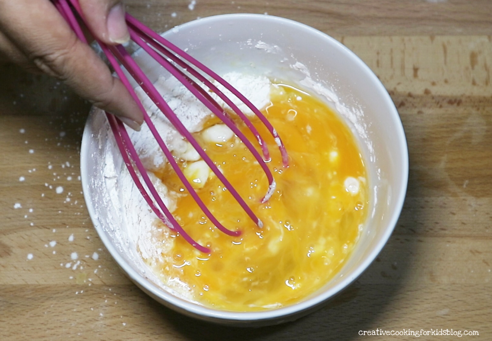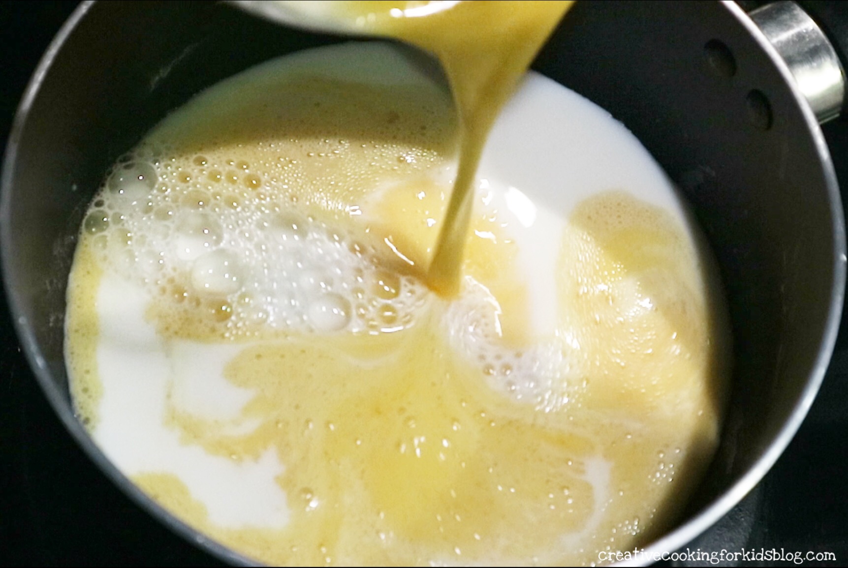 1. ผสมไข่ไก่ แป้งข้าวโพด ผงคัสตาร์ด และน้ำตาลทราย 3 ช้อนโต๊ะ