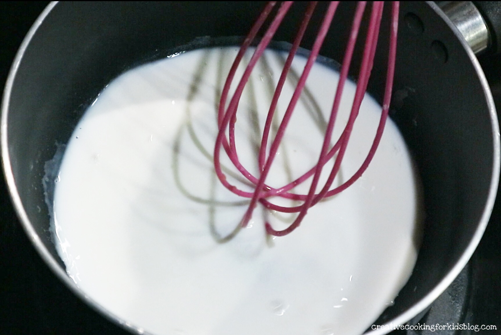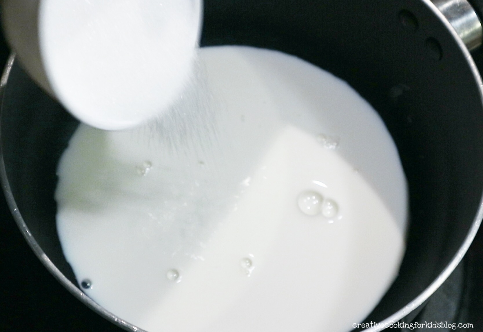 3. ตั้งหม้อบนเตา ใส่นมสด น้ำตาลทราย 2 ช้อนโต๊ะ