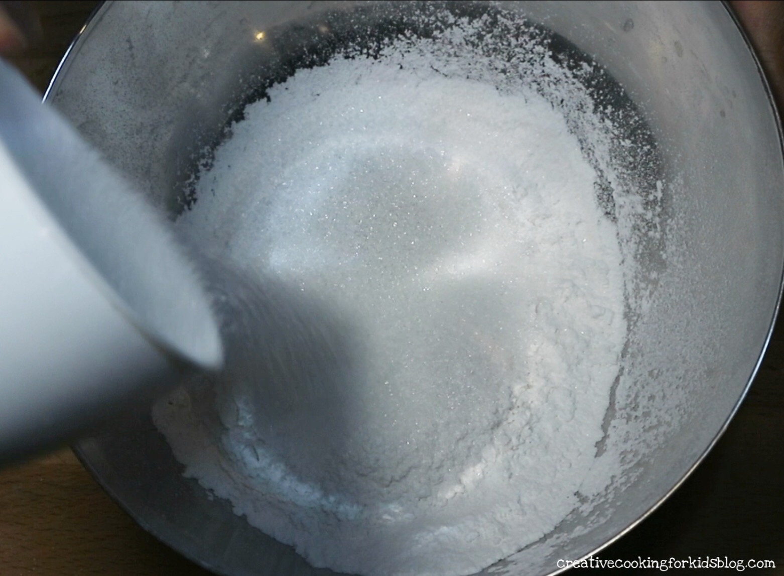 3. (ส่วนผสมที่ 2) ผสมแป้ง ผงฟู เกลือ และน้ำตาล แล้วคลุกให้เข้ากัน