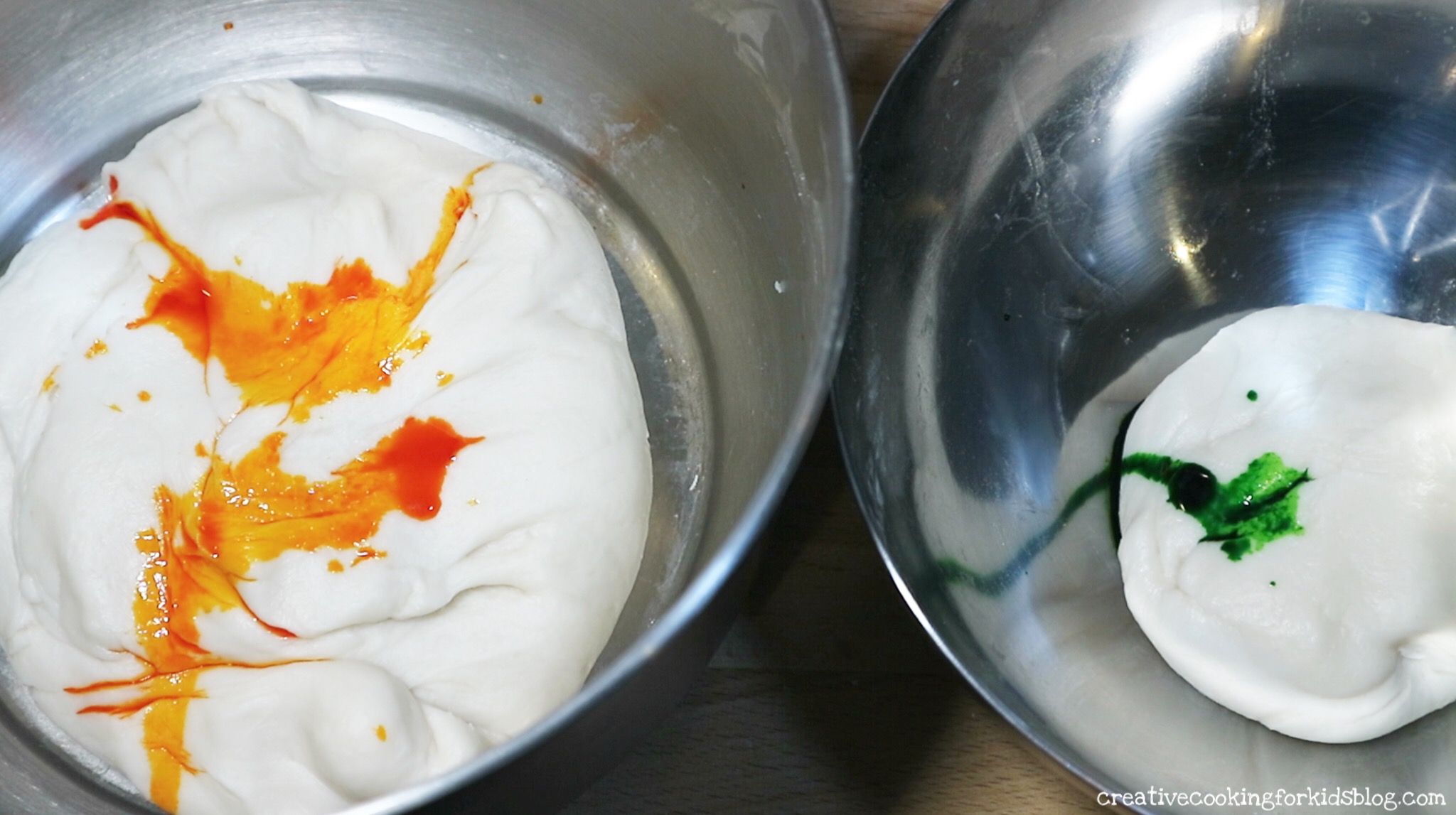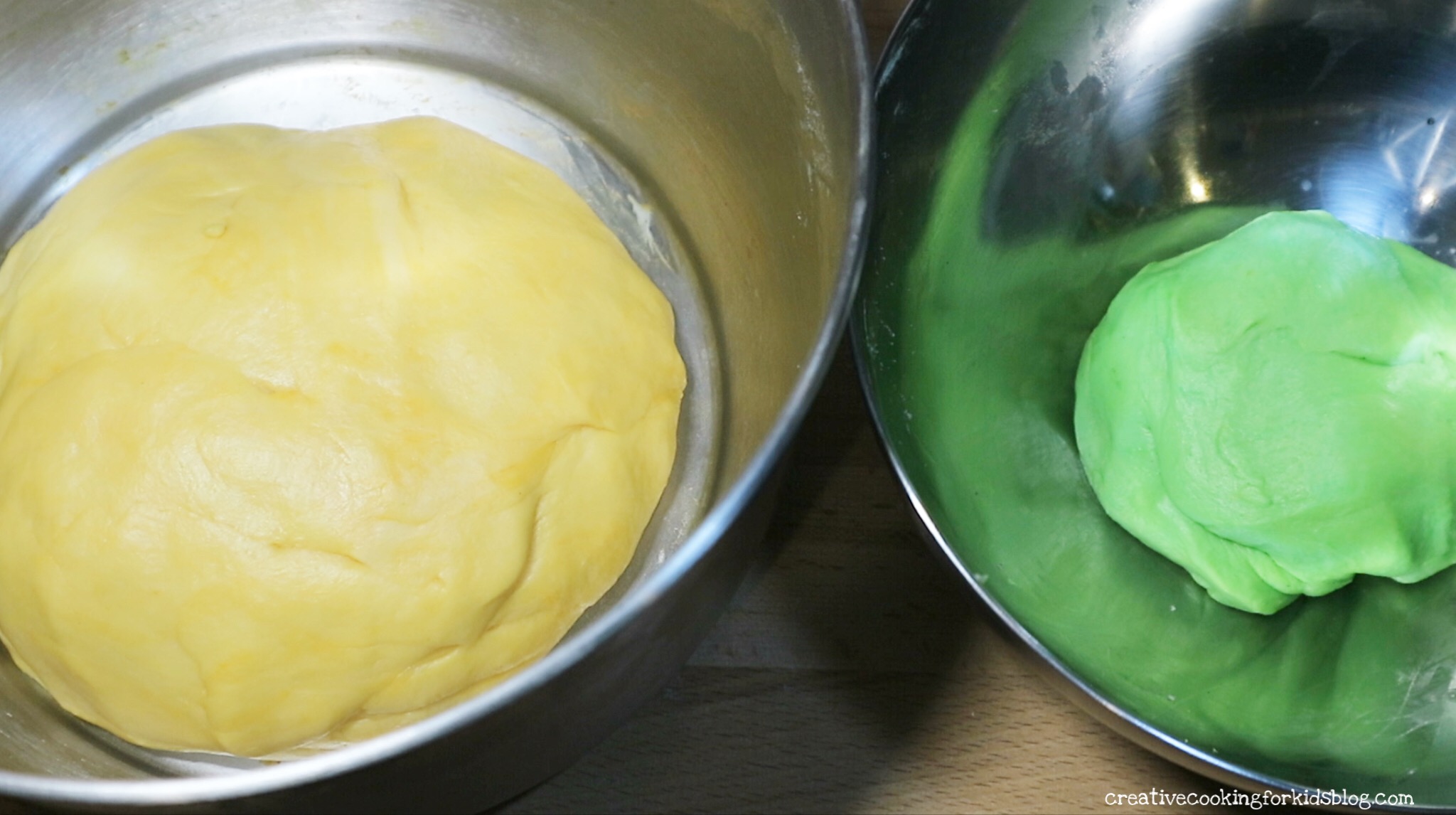 แบ่งแป้งออกมา 1/4 ส่วน แบ่งก้อนใหญ่ผสมสีเหลือง ก้อนเล็กผสมสีเขียว จากนั้นนวดจนสีเนียนทั่วแป้ง แล้วคลุมพลาสติกแรปทิ้งไว้ 20 นาที