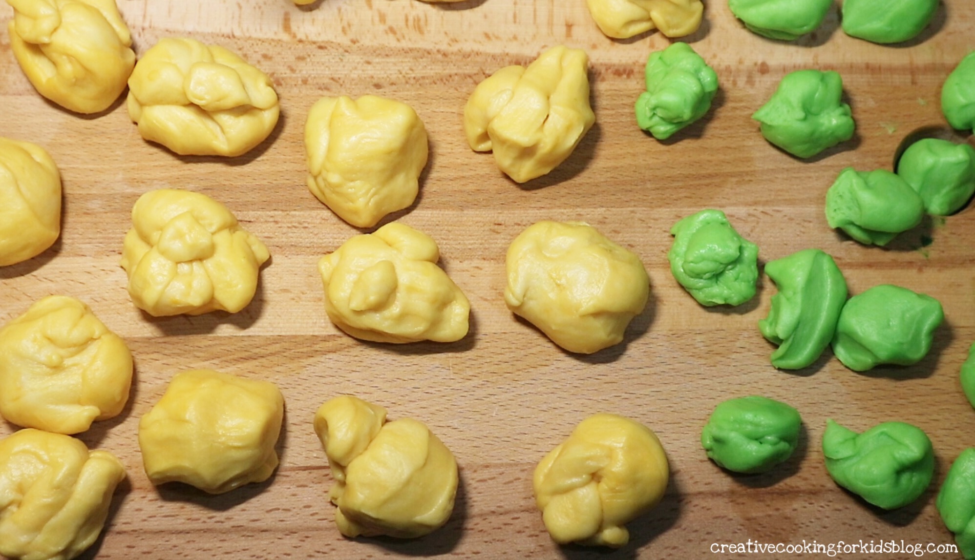 ตัดแบ่งแป้งเป็นก้อนเล็กๆ สีเเหลือง 30 กรัม สีเขียว 10 กรัม​[ads2]