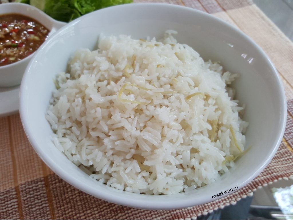 2.ผัดขิงซอย/กระเทียมสับให้หอม ใส่ข้าวสารลงไปผัดให้เข้ากันและมีกลิ่นหอม