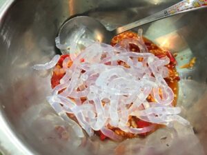 1.เริ่มแรก เราทำน้ำยำก่อนค่ะ ตำพริก กระเทียม พอหยาบๆ จากนั้น ปรุงรสตามใจเราเลยค่ะ น้ำปลา น้ำตาล น้ำมะนาว