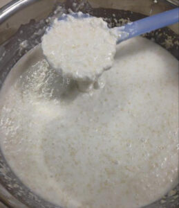 2.ใส่มะพร้าวขูดขาว ผสมให้เข้ากัน และใส่ง า ขาวผสมให้เข้ากัน