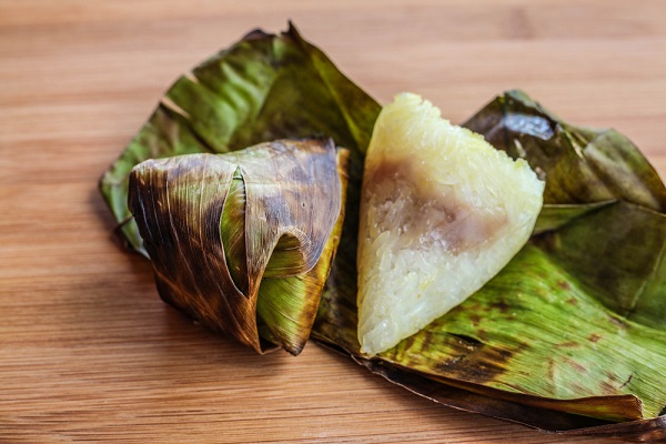 4. ตักข้าวเหนียวมูน 2 ช้อนโต๊ะ วางลงบนใบตอง ตามด้วยไส้เผือก 1 ช้อนโต๊ะ แล้วทับด้วยข้าวเหนียวอีก 1 ช้อนโต๊ะ ม้วนหรือพับใบตองเข้าหากันให้สวยงาม ใช้ไม้จิ้มฟันกลัดหัวและท้าย เตรียมไว้